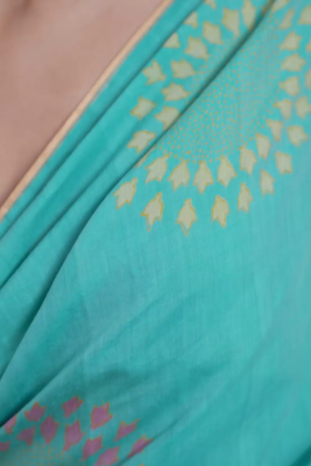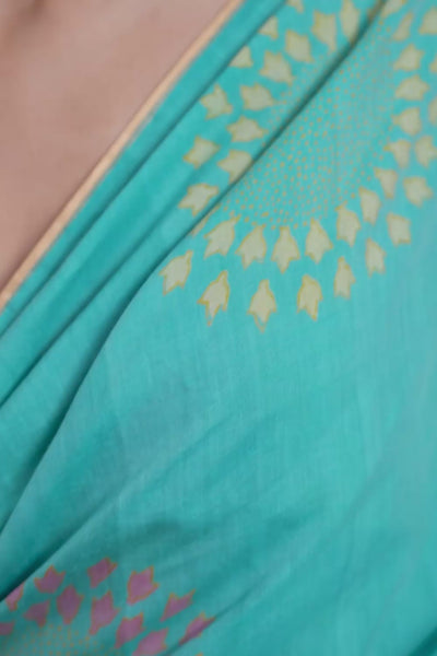 Handwoven delicate Zari border and pure tissue piping and fall finishes the sari, making it ready to wear. This saree was first dyed in cotton dyes and then matching silk dye before it was block printed in Sanganer, Jaipur in Brahma Karma’s bespoke prints by the finest artisans.