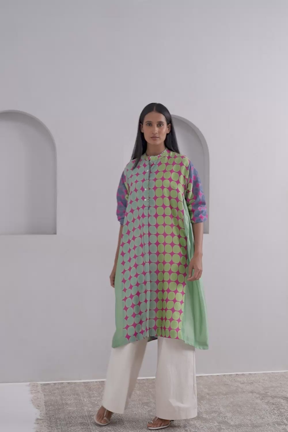 Where timeless craft meets modern ease — this one-size-fits-all tunic dress is designed to drape beautifully on every body. Crafted from luxurious Chanderi (cotton-silk), each piece is hand-dyed and hand block printed in Brahma Karma’s bespoke patterns. The collar and placket feature fine artisanal detailing, while the contrast-printed side panels enhance the silhouette with subtle drama.