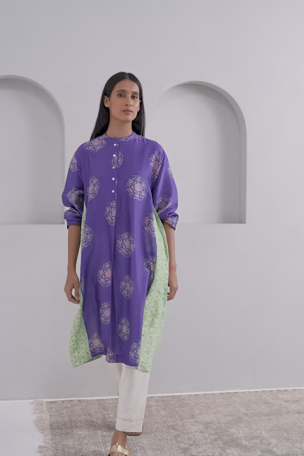 Jaipur Purple One Size Chanderi Cotton-Silk Tunic Dress – Hand Block Printed with Contrast Panels & Slip