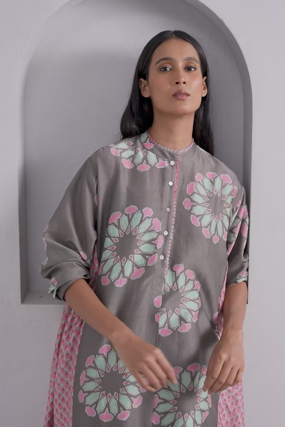 Where timeless craft meets modern ease — this one-size-fits-all tunic dress is designed to drape beautifully on every body. Crafted from luxurious Chanderi (cotton-silk), each piece is hand-dyed and hand block printed in Brahma Karma’s bespoke patterns. The collar and placket feature fine artisanal detailing, while the contrast-printed side panels enhance the silhouette with subtle drama.