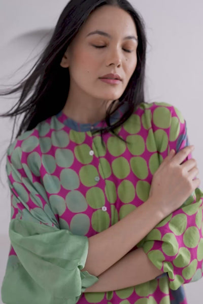Where timeless craft meets modern ease — this one-size-fits-all tunic dress is designed to drape beautifully on every body. Crafted from luxurious Chanderi (cotton-silk), each piece is hand-dyed and hand block printed in Brahma Karma’s bespoke patterns. The contrast-printed sleeve enhances the silhouette with subtle drama.