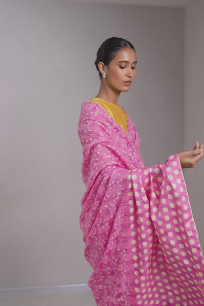 Handwoven delicate Zari border and pure tissue piping and fall finishes the sari, making it ready to wear. This saree was first dyed in cotton dyes and then matching silk dye before it was block printed in Sanganer, Jaipur in Brahma Karma’s bespoke prints by the finest artisans.