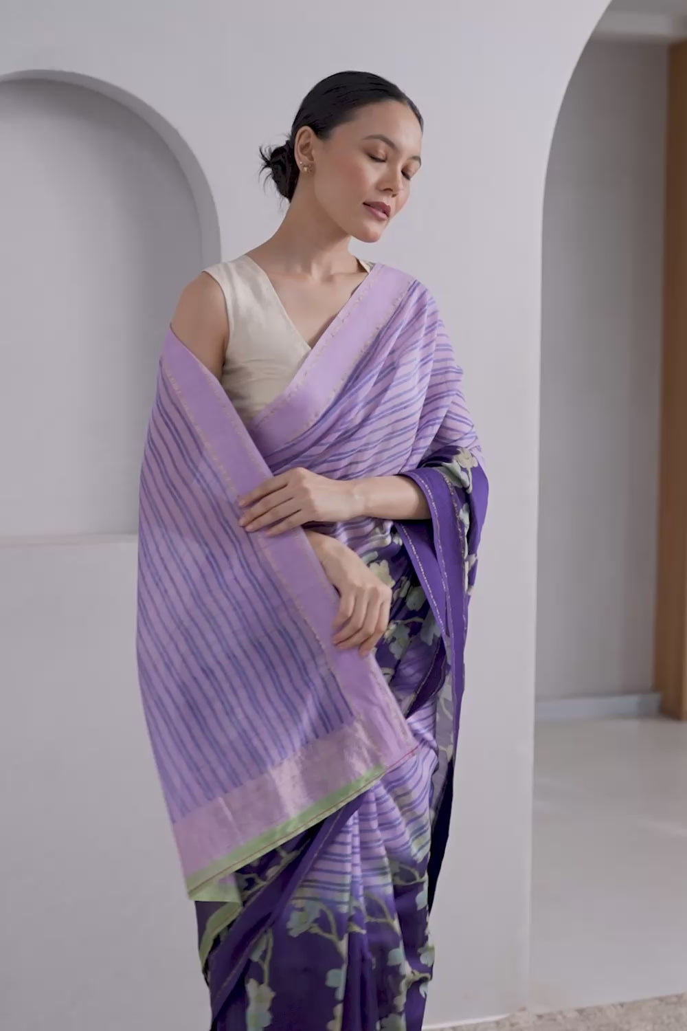 Handwoven silk thread border with subtle zari holds the sari together. This saree was first tie-dyed in contrasting colors and then block printed in Sanganer, Jaipur in Brahma Karma’s bespoke prints by the finest artisans.