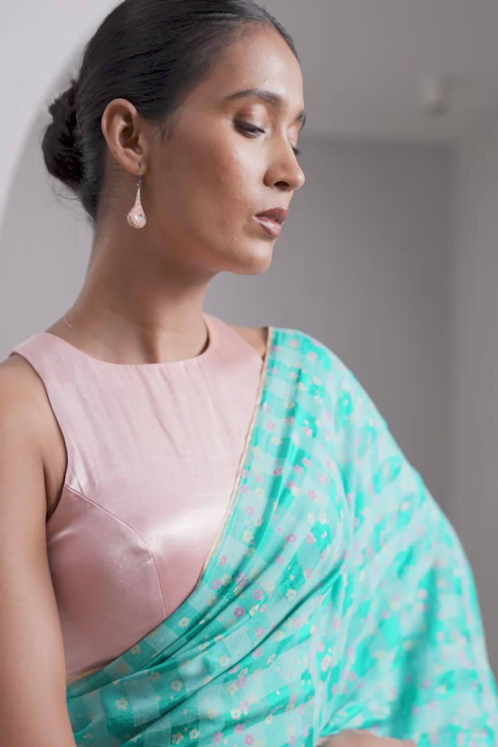 Handwoven delicate Zari border and pure tissue piping and fall finishes the sari, making it ready to wear. This saree was first dyed in cotton dyes and then matching silk dye before it was block printed in Sanganer, Jaipur in Brahma Karma’s bespoke prints by the finest artisans.